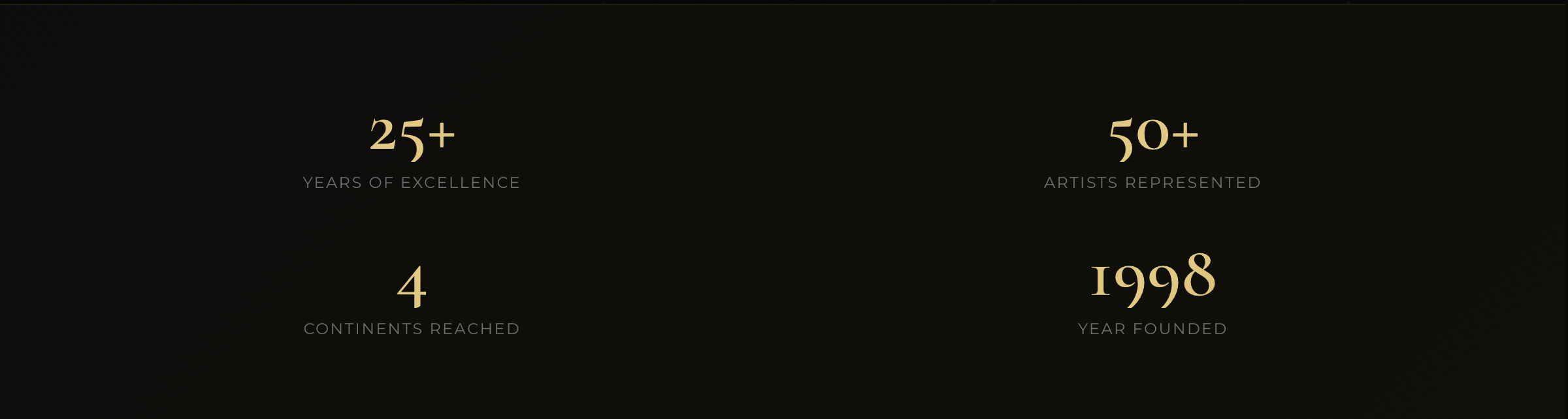 Our mission is to become a leading force in the international commercialization of emerging and established artists, creating unforgettable experiences while building sustainable artistic careers worldwide.